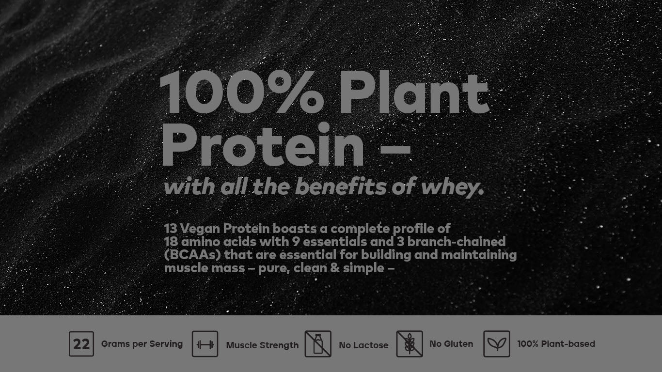 13 Plant Protein boasts a complete profile of 18 amino acids with 9 essentials and 3 branch-chained (BCAAs) which are essential for building and maintaining muscle mass.