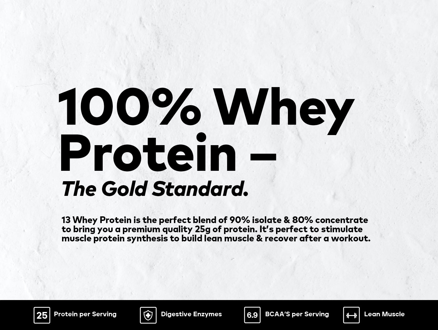 The Gold Standard when it comes to 100% Pure Whey Protein. 13 100% Whey Protein is the perfect blend of 90% whey isolate & 80% whey concentrate to bring you a premium quality 25g of protein per serving.